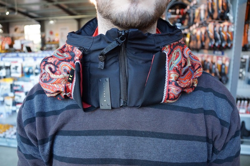 Der Fahrrad Airbag wird nun also um den Hals gelegt und vorne mit einem Reißverschluss verschlossen. Das bunte Muster ist übrigens ein Zusatz, hiermit kann man den Helm an die Kleidung anpassen. Dieser Stoff ist austauschbar und abnehmbar. Nachdem der Reißverschluss geschlossen ist, ist auch schon alles erledigt. Im Vergleich zu einem normalen Fahrradhelm ist das Anlegen mindestens genauso einfach, wenn nicht sogar einfacher. Nach dem Anlegen muss man das Sicherheitssystem noch aktivieren. Hierfür muss man den Druckknopf in das entsprechende Loch drücken. Es ertönen kurze Signaltöne, die LEDs an der Vorderseite leuchten. Der Fahrradhelm ist scharf gestellt.