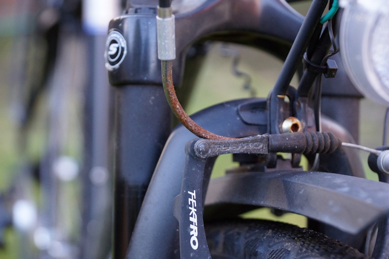 Rostiges VorderbremsenelementDer Teufel steckt, wie eingangs erwähnt, im Detail. So hatte ich mir über all diese Dinge auch Gedanken gemacht, alles war gut, ein tolles Fahrrad hatte ich ja. Doch nachdem ich das Rad leider ein paar Mal im Regen stehen lassen musste und im Regen damit gefahren bin, merkte ich schnell, nicht alle Teile sind aus Edelstahl oder Aluminium. Diverse Schrauben haben eine kleine Rostkappe bekommen, wenn auch nur minimal.