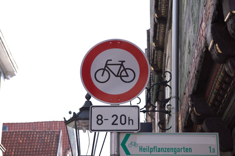 Von 8:00 bis 20:00 Uhr ist das Durchfahren dieser Straße für Fahrradfahrer nicht erlaubt. Hierbei handelt es sich um eine Einbahnstraße, die nur von der anderen Seite durchquert werden darf. Da ich selbst ein solches Schild noch nicht oft gesehen habe, war es mir einfach ein Foto wert.