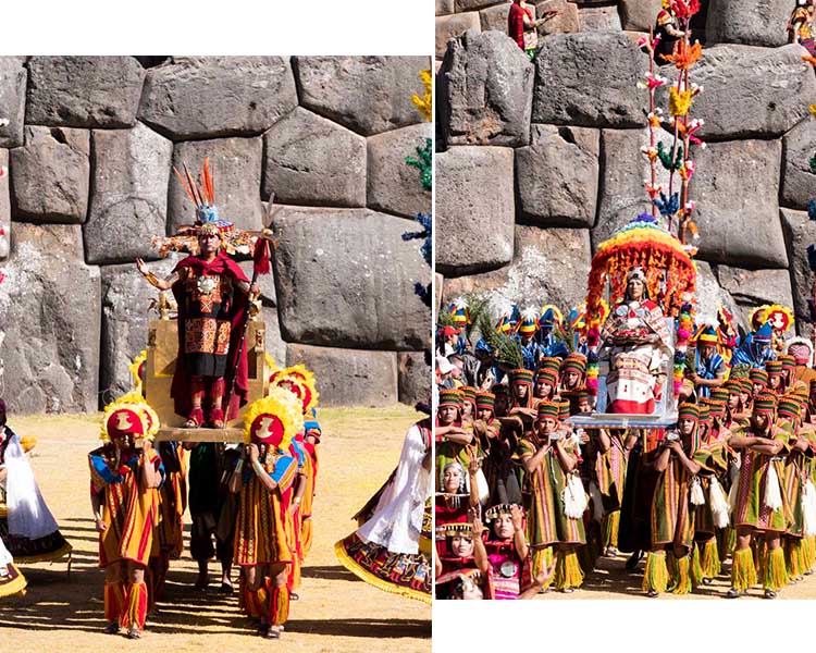 Inti Raymi was also thought to be an elaborate retelling of the origin story of the Inca people. Hundreds of radiantly costumed dancers, both men and women, perform each year. Vibrantly clad in all colors of the rainbow, a retinue of warriors bears the royal Inca in a golden chariot. A contingent of priests and ritual dancers accompany him. A llama is brought to the altar to “sacrifice,” although, nowadays, in consideration of modern sensibilities, the llama is not actually killed.