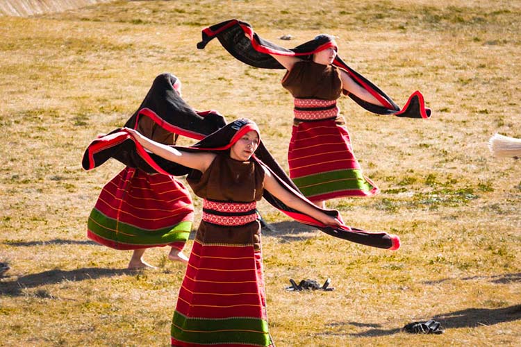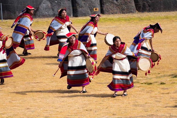 During the third phase, the procession moves to Sacsayhuaman, the imposing ruins overlooking Cusco. Here, three rituals are performed: the Chicha ritual, the Fire ritual, and the Llama ritual. Brilliantly costumed dancers come together and dance in celebration of their Andean heritage to the music of the pinkullo and the tinya (instruments similar to the flute and a small drum, respectively). The ritual ends as each of the brilliantly colorful armies form an enormous contingent and march together, signaling the end of the elaborate ceremony.