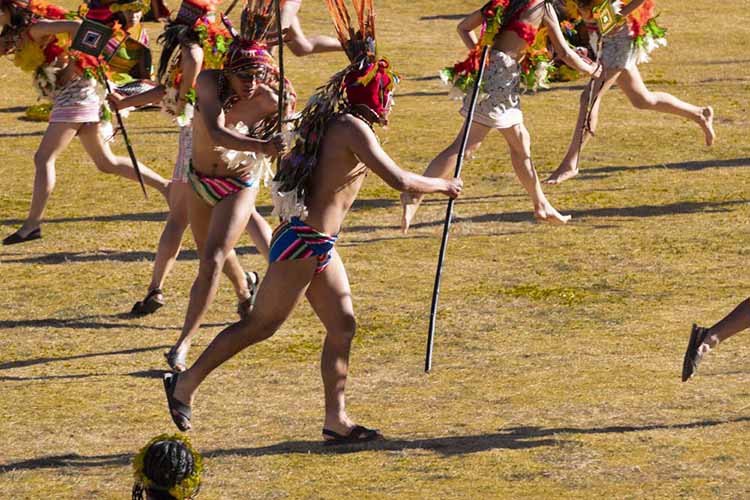 Dancing groups of warriors, robed in an elaborate headdresses and an array of brilliant colors, dance with spears to introduce the third part of the Inti Raymi reenactment.