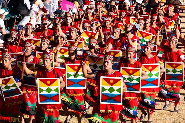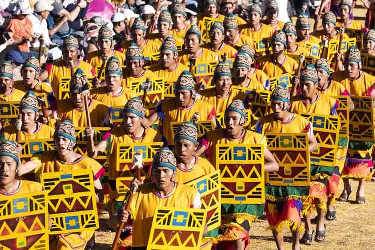 Inti Raymi ends with the departure of the armies, each denoted by its own brilliantly colored uniform, helmet, and geometrically-designed shield.