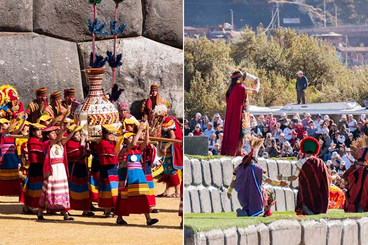 Chicha Ritual: A brilliantly costumed procession carries the sacred pitcher of chicha, a traditional fermented corn beverage that is shared among the celebrants, The enjoyment of chicha is an integral part of the Inti Raymi festivities, both during the reenactment, and throughout the city of Cusco over the course of the days surrounding the celebration.