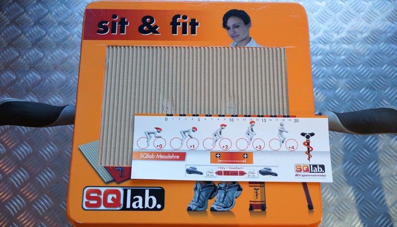 Um das richtige Maß für den neuen Sattel herauszufinden, gibt es eine einfache und effektive Methode. Im Fahrradfachgeschäft hat man einen Messschemel dafür, um den genauen Abstand der Gesäßknochen auszumerzen. Wie auf dem Bild zu sehen ist, setzt man sich auf eine Art Hocker, unter dem Hintern befindet sich nun ein Stück Wellpappe. Zieht man sich nun in einer geraden Sitzposition kräftig an den Griffen nach unten, so drücken unsere Gesäßknochen in die Pappe. Nun steht man auf und sieht auf der Wellpappe gut die Eindrücke unserer Sitzknochen.