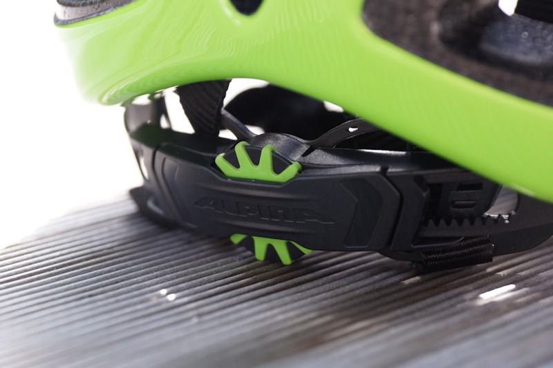 Das Stellrad kann bequem und problemlos mit einer Hand bedient werden. Für eine optimale Anwendung ist der Mythos Fahrradhelm auf maximale Größe eingestellt, wird dann aufgesetzt und nun mittels Drehung am Stellrad an den Kopf angepasst. Im Idealfall sitzt der Alpina Mythos 2 so, dass er vorne über den Augenbrauen abschließt und gerade auf dem Kopf sitzt. Er sollte nicht wackeln und auch ohne den Kinnriemen auf dem Kopf halten. Hat man das Drehrad am Hinterkopf eingestellt, kann man nun den Ratschenverschluss am Kinn schließen. Hierbei, so die Empfehlung an mich, solle man immer einen fingerbreit Platz zwischen Riemen und Kinn lassen.