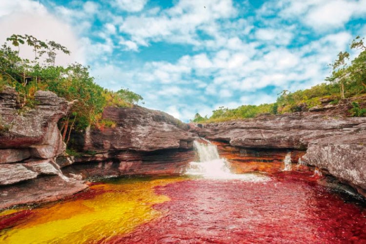 During these months, this striking technicolor dream comes to life in Caño Cristales, mainly from a plant called Macarenia clavigera that creates an array of deep reds, purples, and pinks. The water level and weather conditions during these months also make the difference. The light hits these pigments brilliantly. Other factors include black rocks, yellow algae, green sands, and blue waters coming together with the Macarenia clavigera; the result is pure magic.