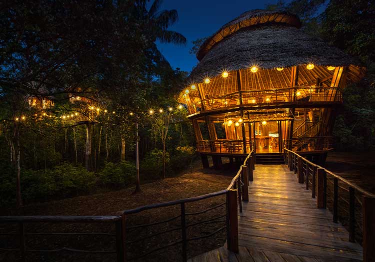 Located just 40 kilometers up the river from the city of Iquitos, on the banks of the one and only Amazon River, the Ceiba Tops Lodge is the ideal choice for your jungle stay. Apart from the delightful fully-air conditioned lodge rooms, some of the other amenities making the Ceiba Tops Lodge stand out are its private bathrooms, a swimming pool, a water slide, a hammock house, and free high-speed Wi-Fi in all public areas. Sip on a refreshing cocktail in the Esmeralda Lounge, and retire to your elegant guest room (either in standard, Jr. Suite, Ministerial Suite, or Presidential Suite categories) to relax after a long day of jungle adventures. If you are staying at Ceiba Tops for more than two nights (which we highly recommend), make sure to sign up for their full-day excursion to the canopy walkway!